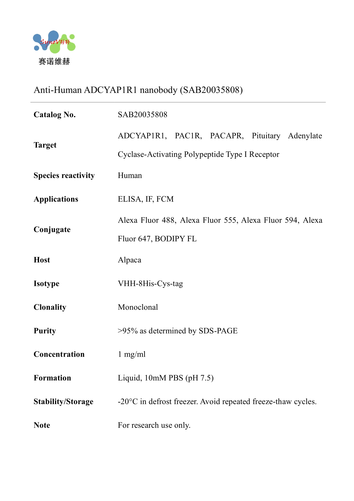 Aliases: ADCYAP1R1, PAC1R, PACAPR, Pituitary Adenylate Cyclase-Activating Polypeptide Type I Receptor Species reactivity: Human Applications: ELISA, IF, FCM Isotype: VHH-8His-Cys-tag