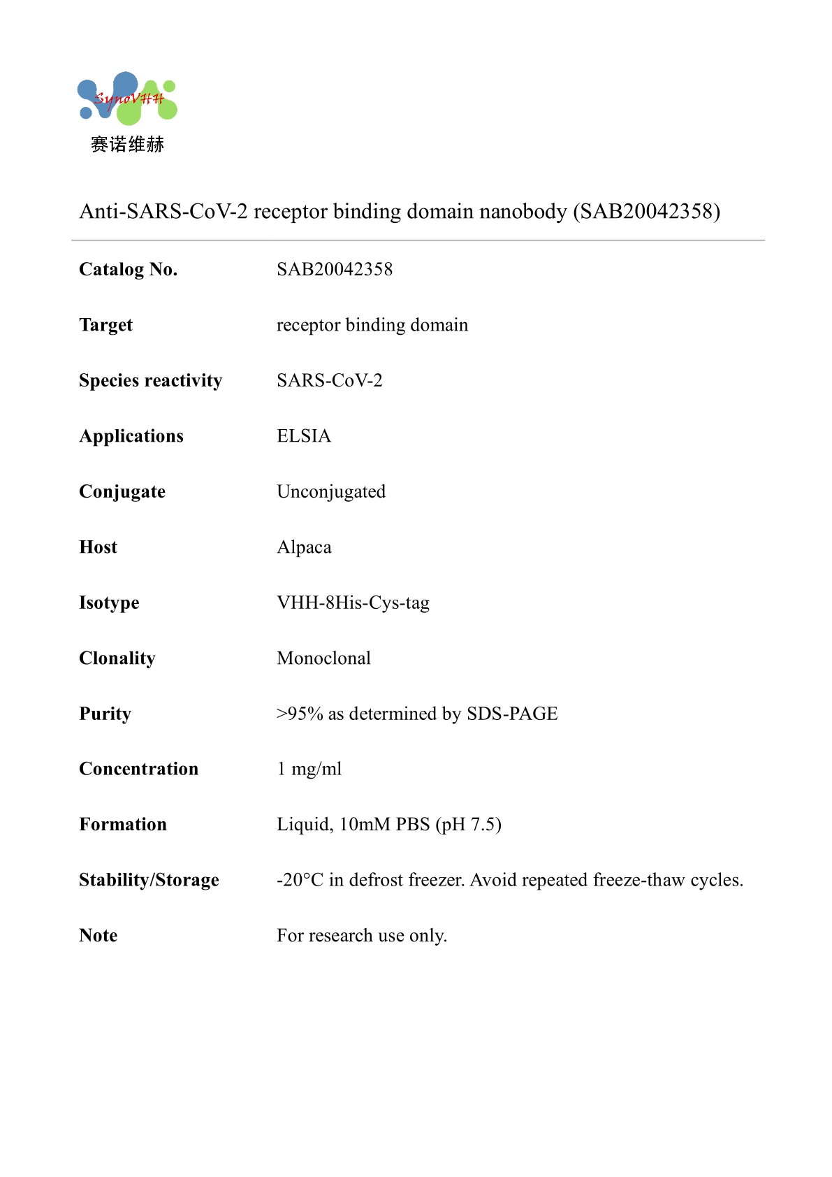 Anti-SARS-CoV-2 receptor binding domain nanobody (SAB20042358)