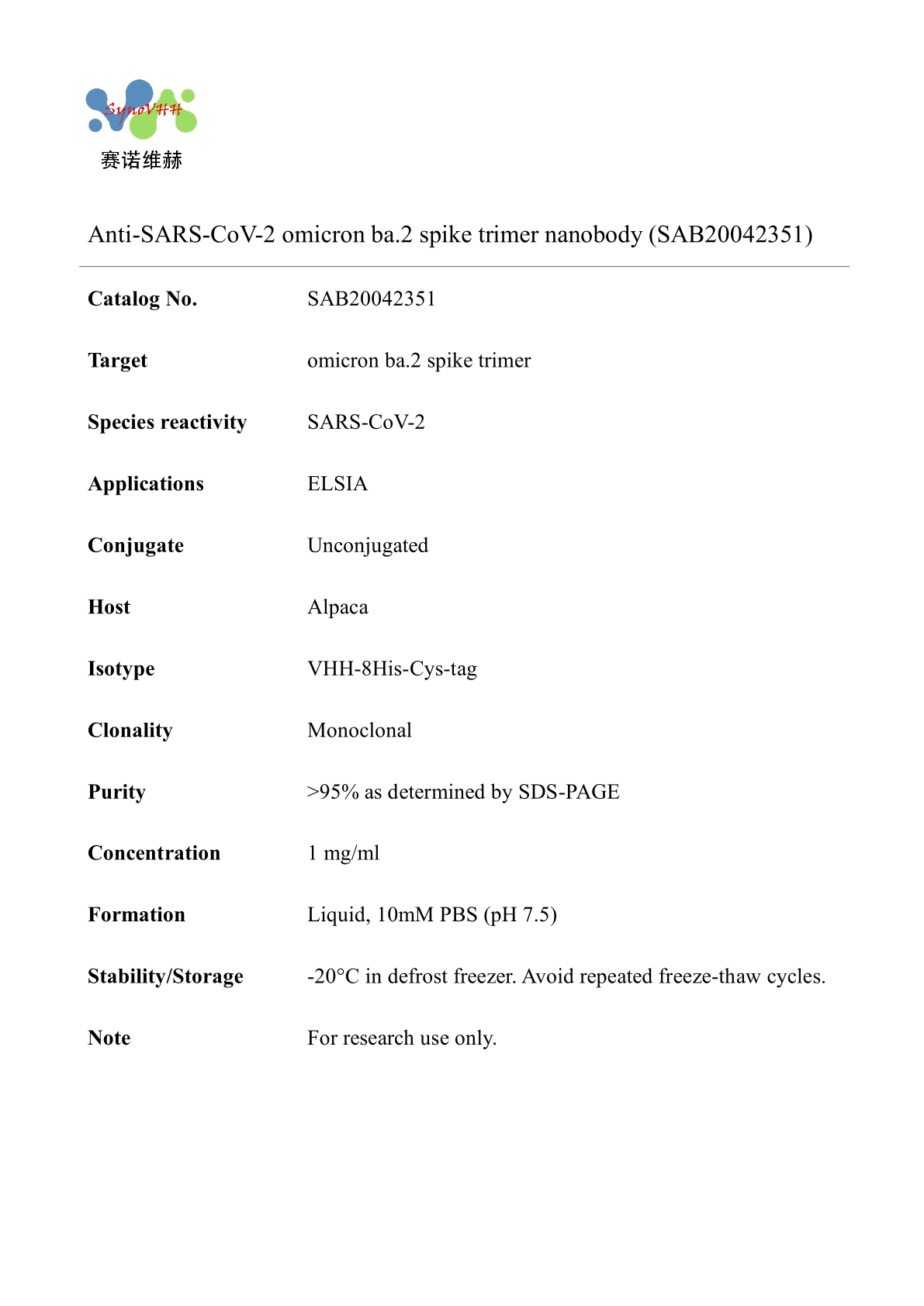 Anti-SARS-CoV-2 omicron ba.2 spike trimer nanobody (SAB20042351)