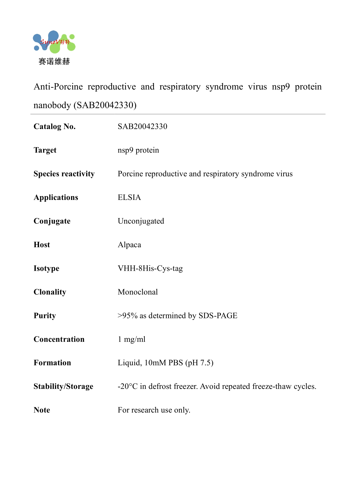 Anti-Porcine reproductive and respiratory syndrome virus nsp9 protein nanobody (SAB20042330)
