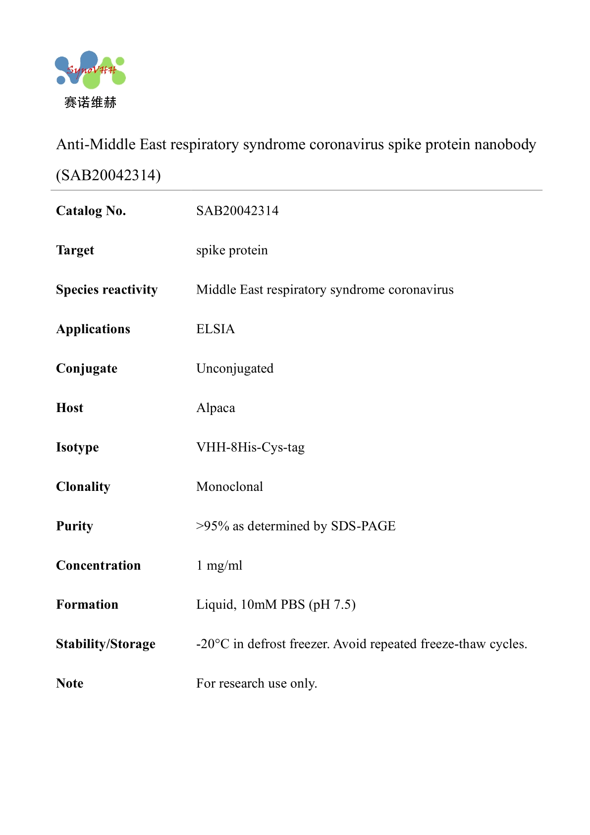Anti-Middle East respiratory syndrome coronavirus spike protein nanobody (SAB20042314)