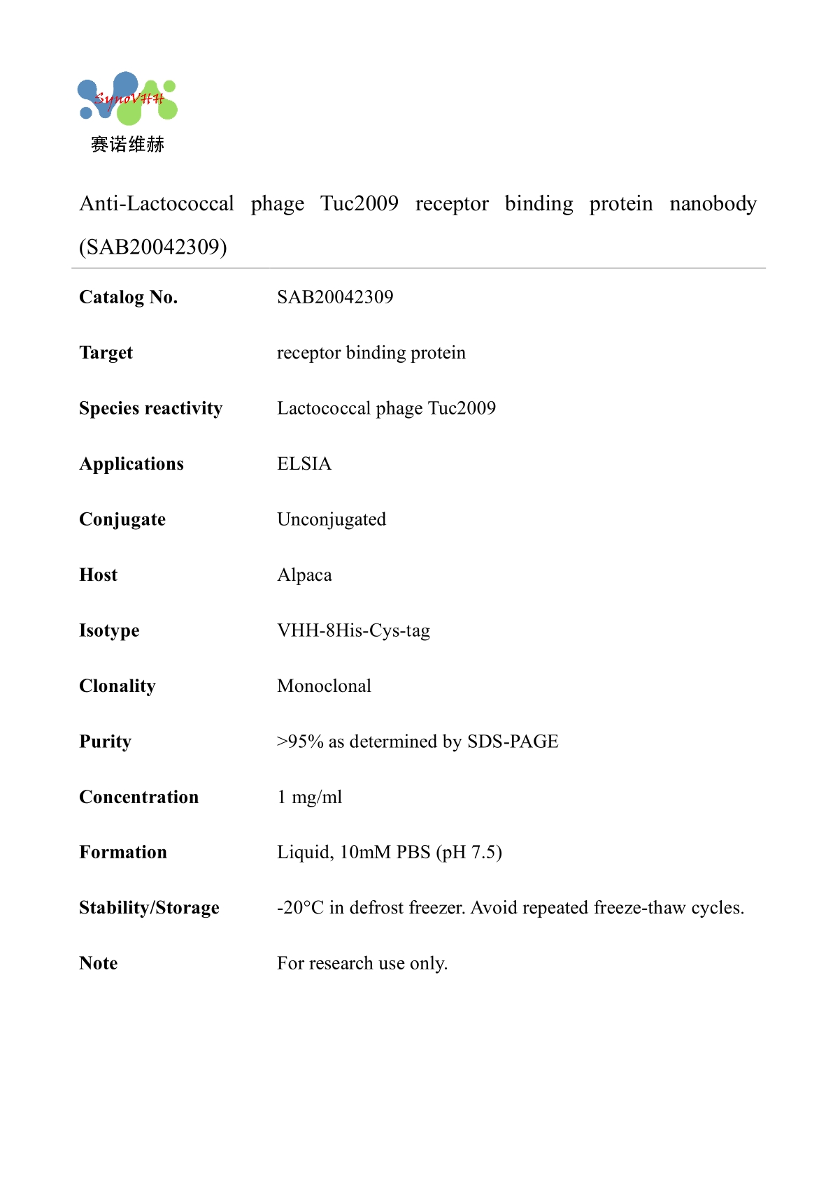 Anti-Lactococcal phage Tuc2009 receptor binding protein nanobody (SAB20042309)